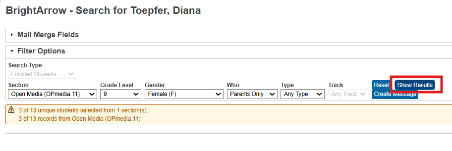 2. With your filters now added, you can use the Show Results button to review which students/families will be included to receive your message.