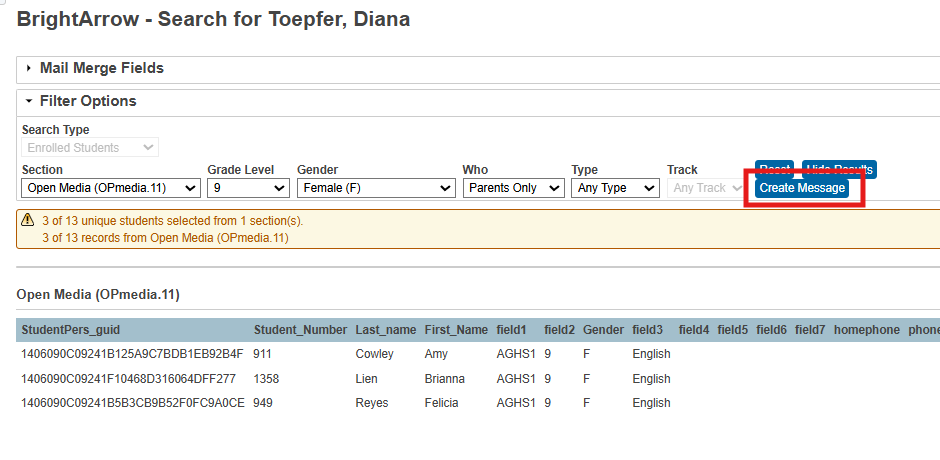 3. If your results look good, use the Create Message button to get started creating your BrightArrow message. If you need to make changes, you can click the Reset button to start over.