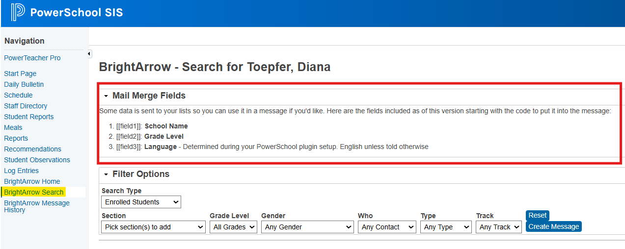 With the "Search Type" as "Enrolled Students" you will see 3 mail merge fields listed in the Mail Merge Fields section. When you are creating your message in BrightArrow, there is a Mail Merge Field drop-down that will allow you to select these 3 fields along with some other options as determined by your organization's administrators. If your Search Type in PowerSchool was set to Enrolled Students, you can use any of the mail merge fields in BrightArrow.