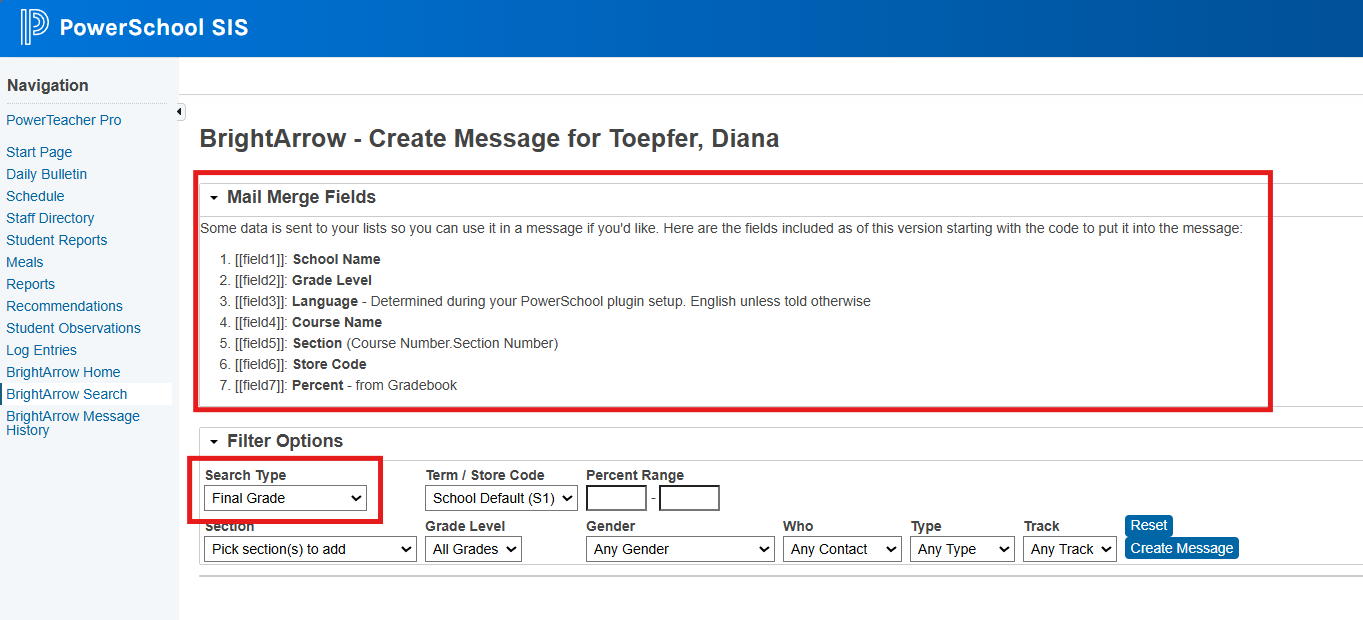 With the "Search Type" as "Final Grade" or "Missing Assignments" you will see additional mail merge fields listed in the Mail Merge Fields section. These fields will change depending on the Search Type you chose. When using "Final Grade" or "Missing Assignments" as the search type, the fields shown in PowerSchool will override any fields shown in the BrightArrow create message screen's Mail Merge Field drop-down.