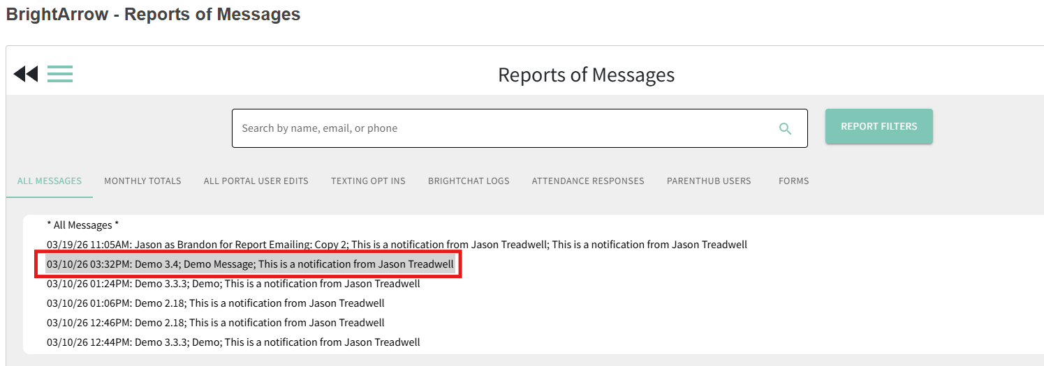 - Messages you sent will be shown in order of most recent to least recent. If you do not see a recent message, try checking your Report Filters by clicking the button located near the upper-right of the page.