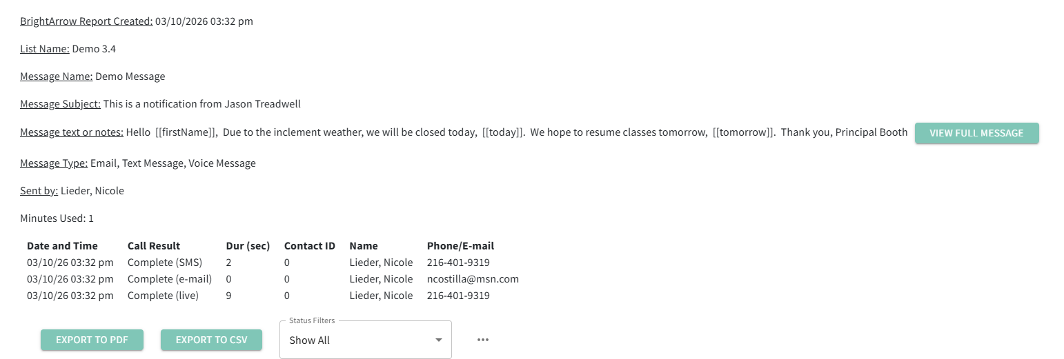 In PowerTeacher, you have access to the BrightArrow Message History where you can see a summary report for any message you sent. BrightArrow reports include information to help you verify that your message was delivered as expected to your recipients.