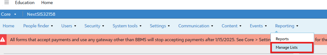 - In Blackbaud Core, navigate to Reporting > Manage Lists