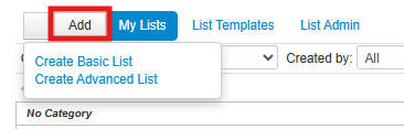 - Click Add to start creating your list, then choose either "Create Basic List" or "Create Advanced List" from the drop-down options. This article demonstrates the Blackbaud Lists feature with a Basic list, but the functionality will be the same if you choose to create an Advanced list instead.