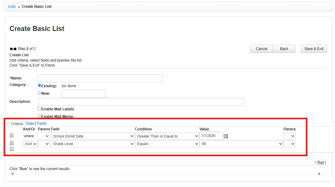 - Click Run in the bottom-right to see the results of the list you built. Make any changes and re-run as needed.
