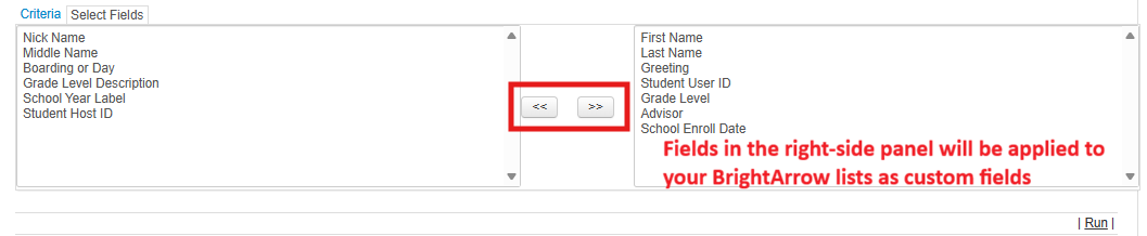 - Select any additional fields that you would like to have in your BrightArrow list. The fields you choose will be added as custom fields which can be used for internal processes, mail merge fields in messages, and for creating filtered or subset lists.