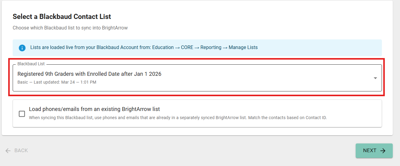 - Synced lists: With synced lists, you build the list one time and it automatically updates each night with your recipients' current information so there is no need to manually update any contact information in the BrightArrow list itself. You enter the information in Blackbaud, and your BrightArrow list updates automatically with the new information that night. With the Blackbaud Lists feature, you can choose to use the list one time or have it sync to BrightArrow on a nightly basis.