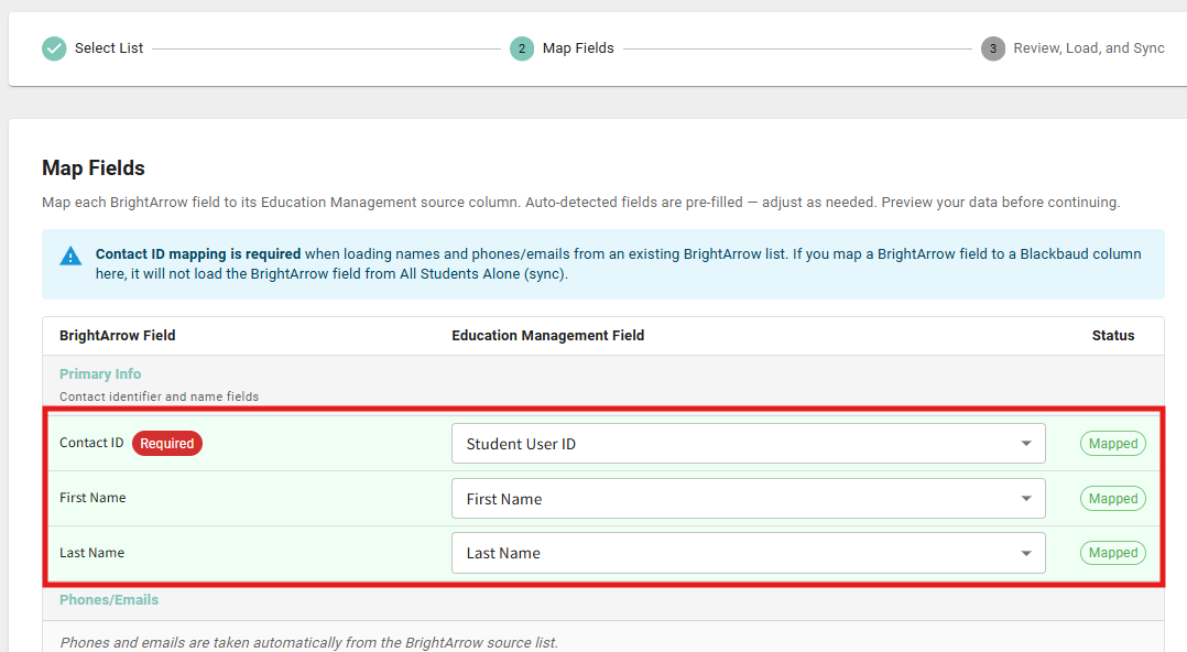 The top portion of the "Map Fields" page contains "Primary Info" that is necessary for BrightArrow messages to send properly. Contact ID/Student ID, First Name, and Last Name must all be used for BrightArrow to link to your new Blackbaud list. Those three fields will look to the existing BrightArrow list you chose in Step #2: part 5 above and sync the information from that pre-existing list over to your new Blackbaud list.