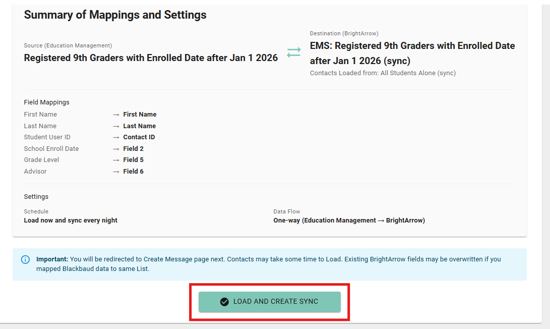 - Give your data/mappings a final review, then click the button to Load and Create.