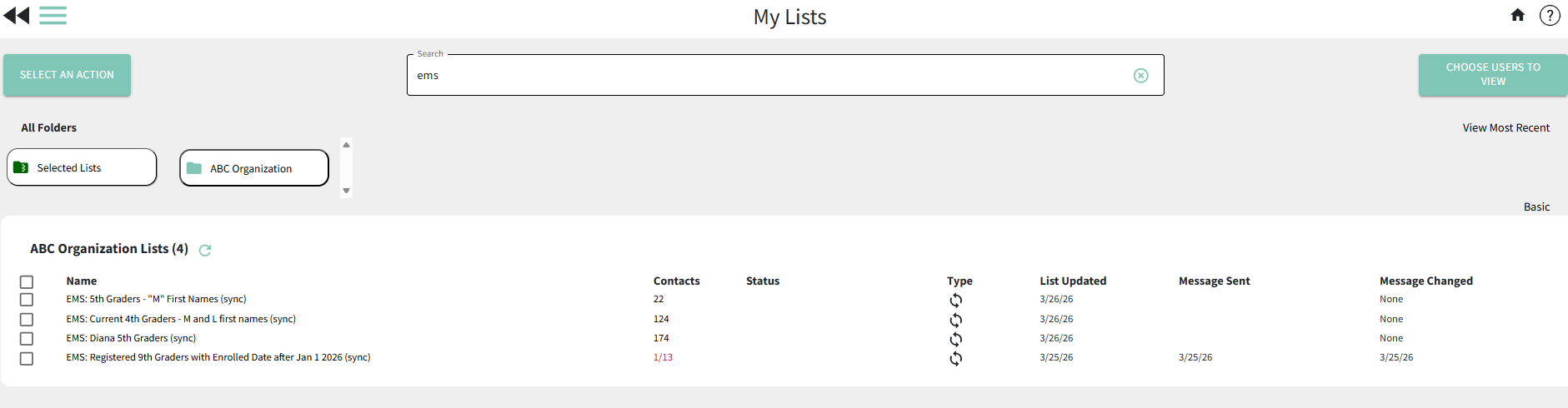If you've created a synced list using the steps above, you can find the list again in the future on your My Lists page in BrightArrow. Synced lists that were created originally in Blackbaud EMS will be in your My Lists page with the prefix "EMS:".