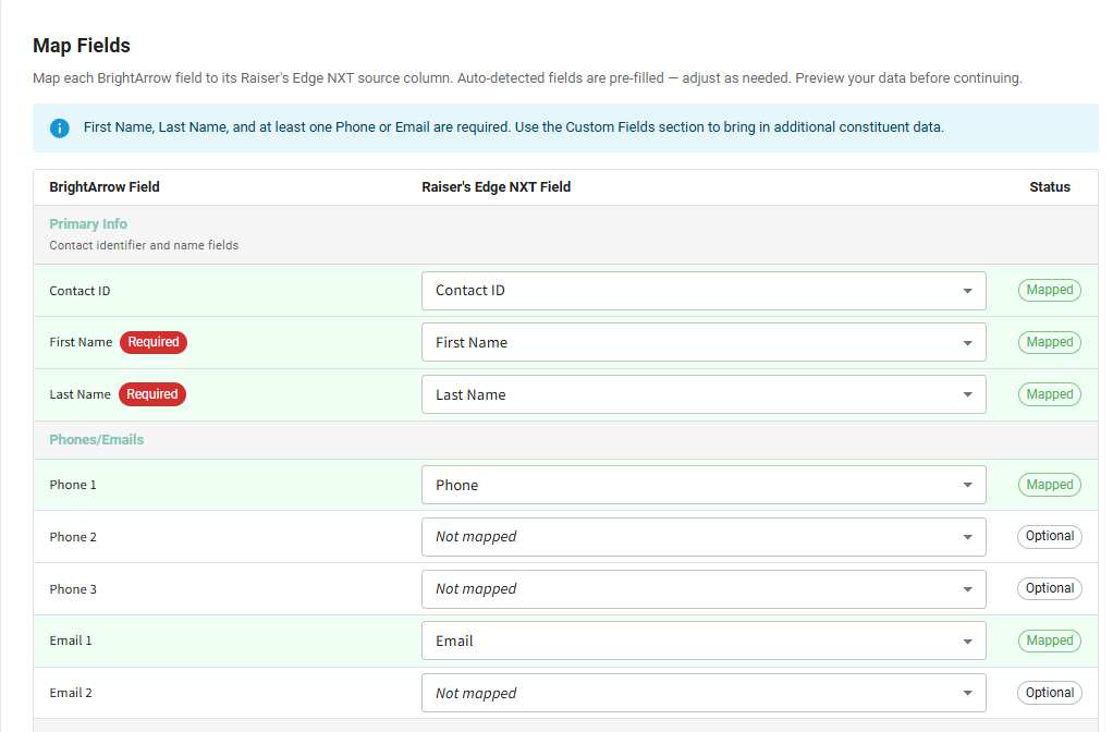 The top portion of the "Map Fields" page contains "Primary Info" and a "Phones/Emails" section that are necessary for BrightArrow messages to send properly. Names, phones, and emails MUST be mapped in order for BrightArrow to know where to send your message. For example, if you choose to send an email message but have not mapped the email addresses, BrightArrow will not have an email address on file for your contacts so the email message will not be sent.