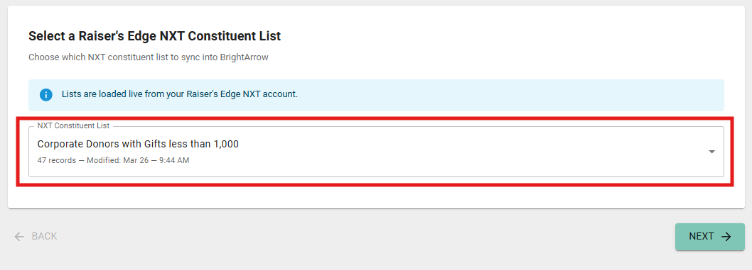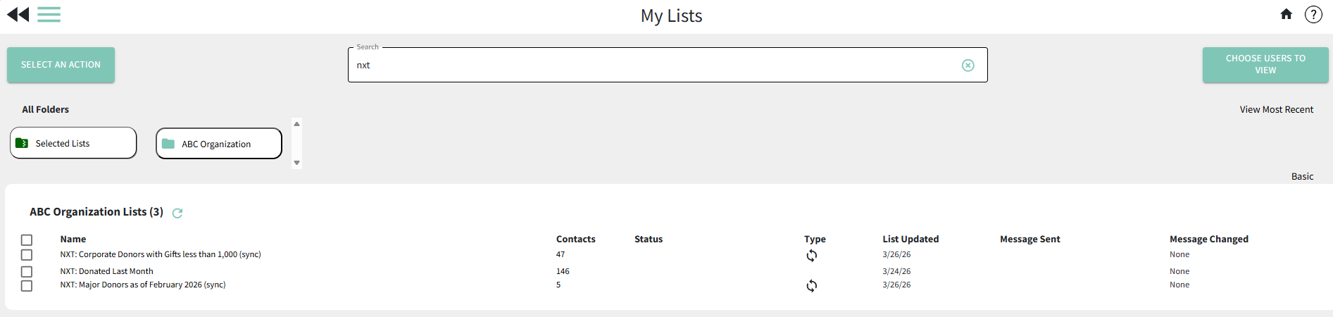 If you've created a synced list using the steps above, you can find the list again in the future on your My Lists page in BrightArrow. Synced lists that were created originally in Raiser's Edge NXT will be in your My Lists page with the prefix "NXT:".