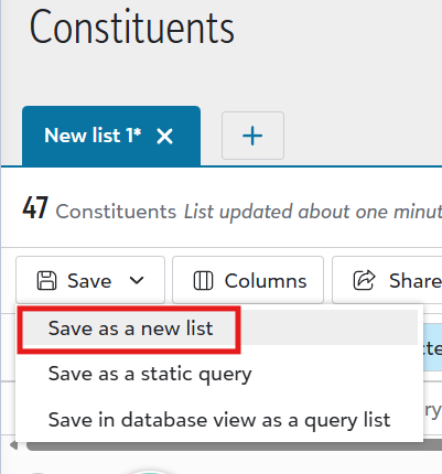 With Blackbaud Lists, you have the option to load the list for one-time use or to create the list as a synced list that will be on your My Lists page and sync to Blackbaud each night.