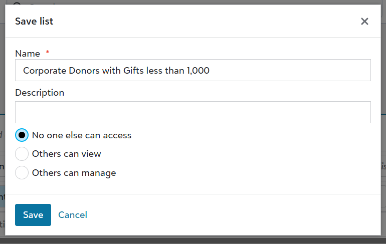 - Name your list. Give it a name that clearly describes it, especially if you intend to sync it with BrightArrow to use again in the future. Then click Save.