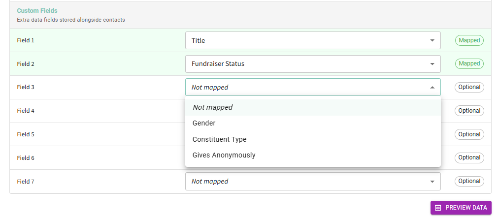 - In the Custom Fields section, choose the fields you would like to have in your list (for mail merges) by selecting them from the drop-down options. Note that the custom fields in your Blackbaud List will be different than the fields in any pre-existing BrightArrow lists you may have The fields available for mail merges in your Blackbaud List will be whatever fields you map in the Custom Fields section.