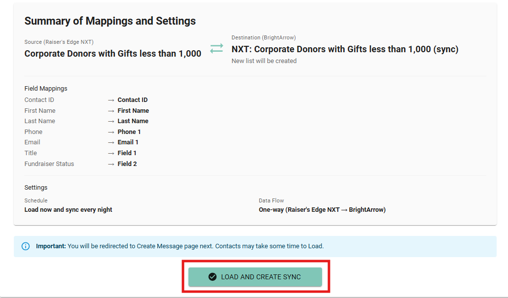 - Give your data/mappings a final review, then click the button to Load and Create.