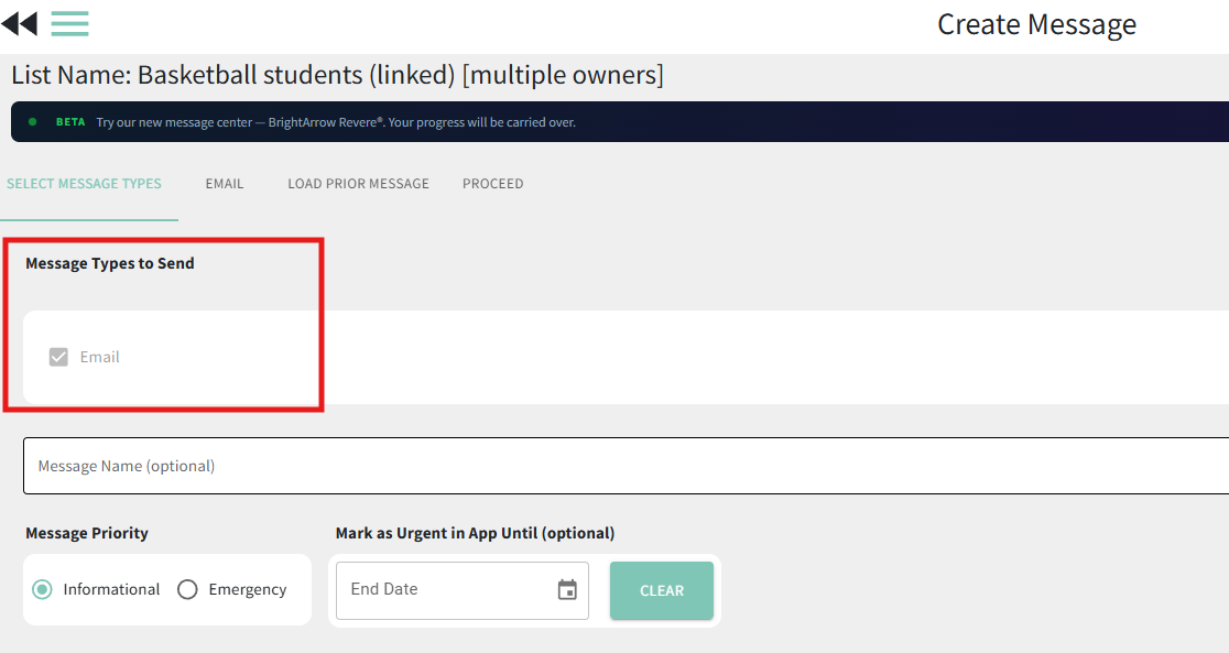 For example, if a user goes to send a BrightArrow text message but only sees the option to send an email. In the example that a user has only emailing enabled for them, when they go to create a message it may open directly in the email creation page. If they navigate to the Select Message Types option, email would be the only option showing (screenshot below). This article will show you how to enable the text messaging and/or voice call options for them.