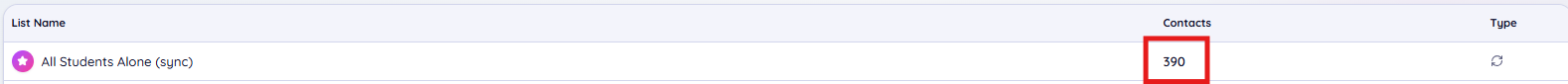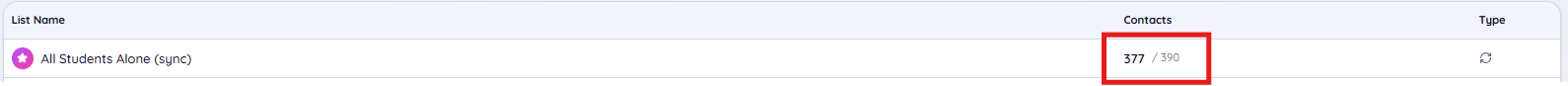 - Two numbers shown as # / # indicate that not all of the contacts in the list are enabled. The first number indicates the number of enabled contacts and the second number indicates the total number of contacts in the list. In the example below, the "All Students Alone (sync)" list has a total of 390 contacts but only 377 of them are enabled. Only enabled contacts will be considered to receive the message you send to the list.