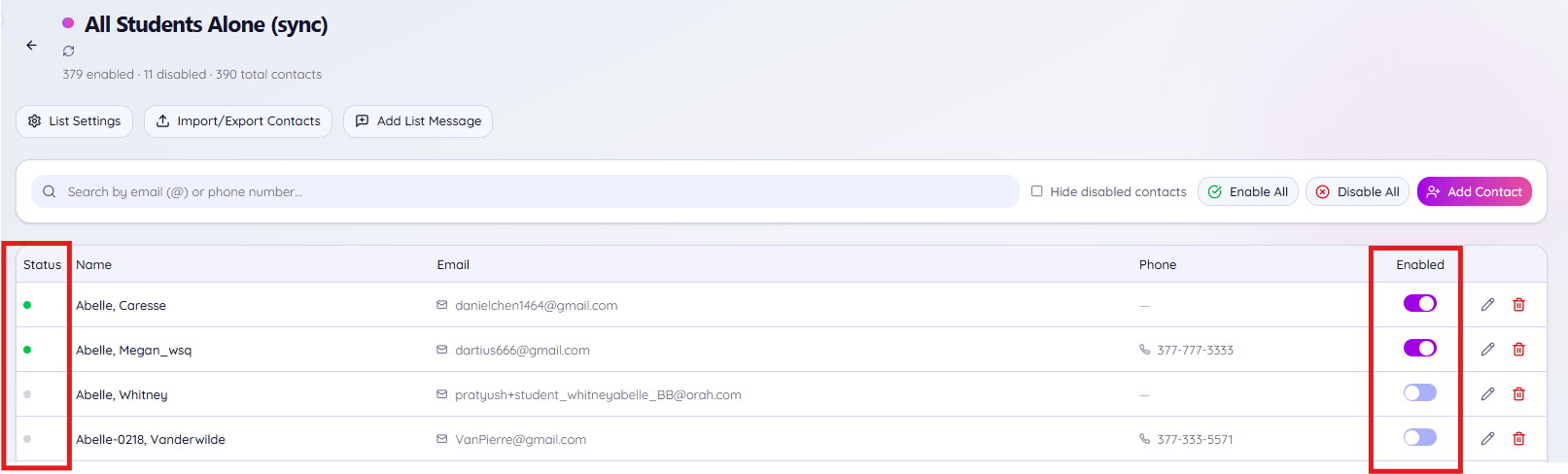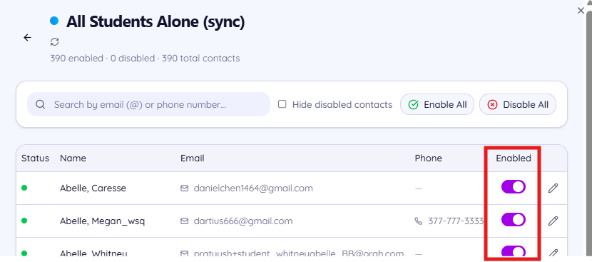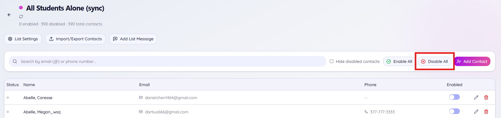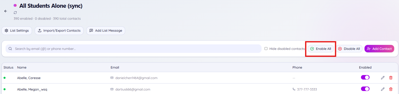 Yes, you can enable or disable all contacts in the list with the click of a button. You do not need to manually turn on or off the Enabled toggle for each individual contact if you want them all to have the same status. This can be especially helpful in the case that you either want to make sure all list contacts are sent your message, or conversely if you want to only send your message to a few of the contacts in your list.