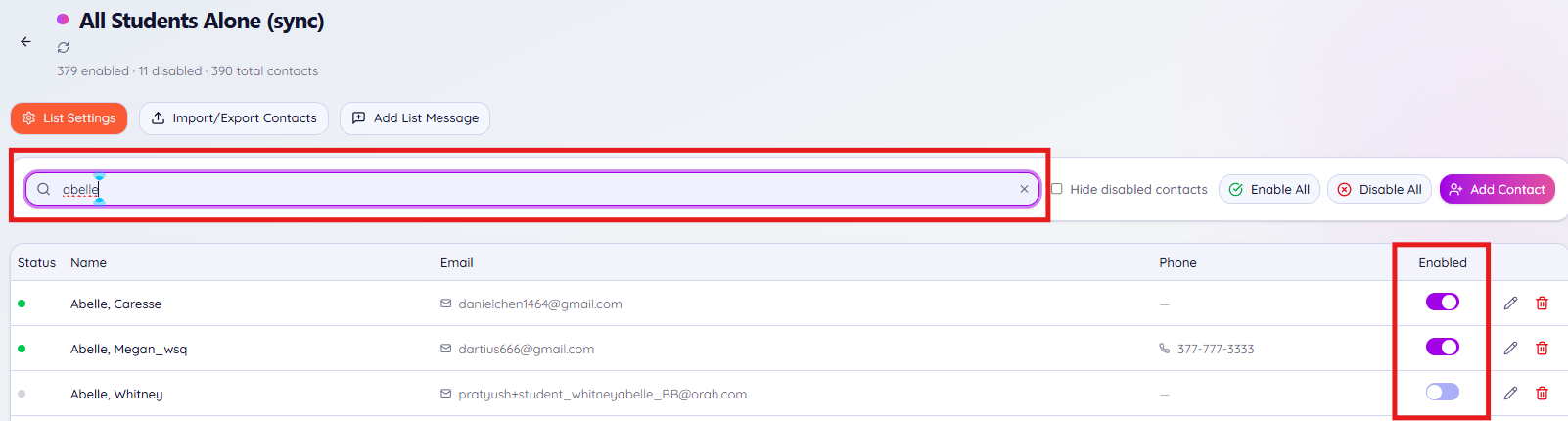 With all your list contacts now showing, use the search bar to search for the contact. You can enter their name, email address, or phone number in the search field to find them. Once you've located them in the list, look to the "Enabled" column and use the toggle to enable or disable the contact as needed.