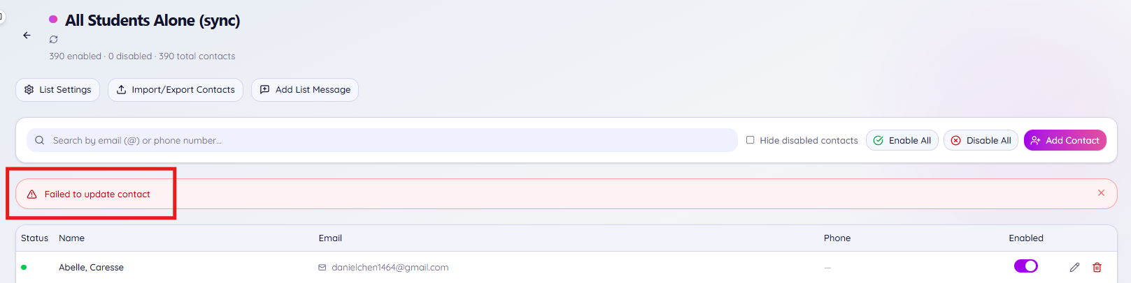 If you're trying to change the enabled / disabled status for a contact but you're seeing an error that says "Failed to update contact," that is likely because the list's settings have the "lock contact selection" turned on. With "Lock contact selection" turned on in the list's settings, you will not be able to enable or disable contacts within the list.