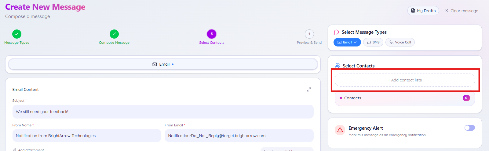- With your message started, click the "+Add Contact Lists" button to choose which contact list(s) you will send the message to.