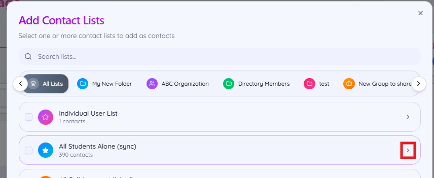 - The "Add Contact Lists" window will open. Find the list(s) you want to send your message to.