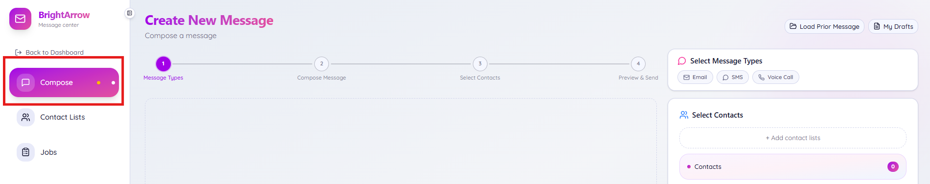 The landing page in the Revere Message Center is the message creator, but if you need to navigate to it from somewhere else in the interface you can get there by clicking the "Compose" button in the left panel.
