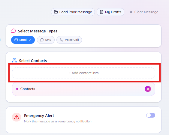 - With your message created, you will now choose the contacts to send it to. In the Select Contacts box, click "Add contact lists"