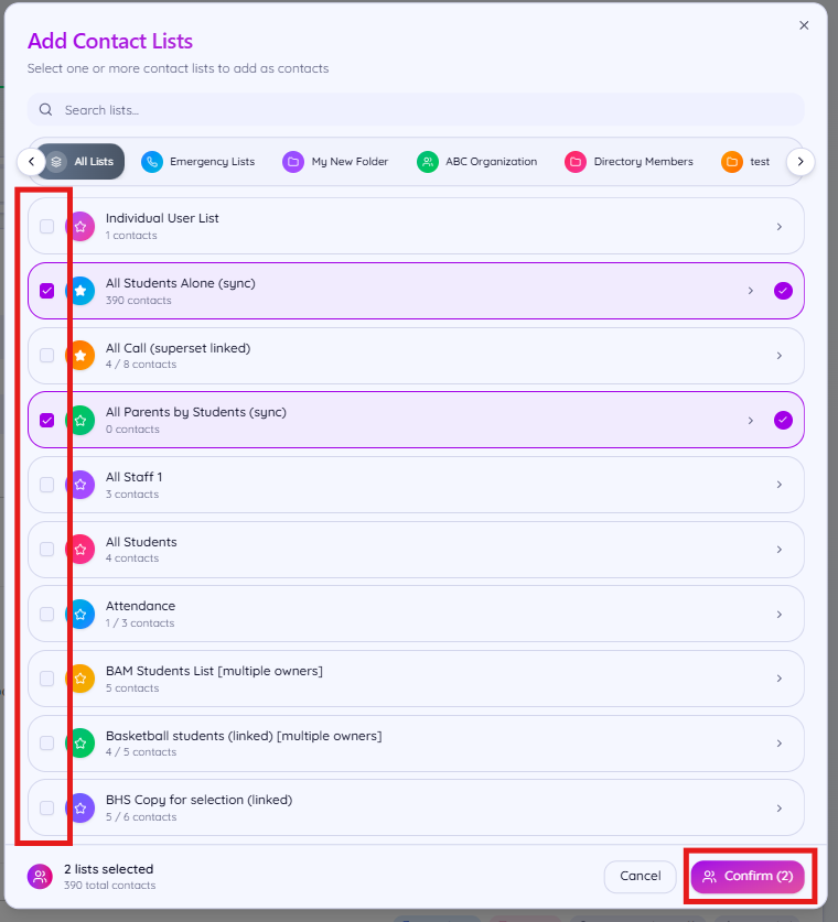 - Mark the checkbox next to each contact list you want to send your message to, then click "Confirm"
