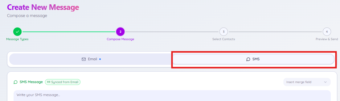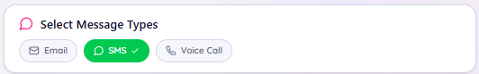 - On the Create New Message page, click the "SMS" bubble found in the Select Message Types section. If you are also sending an email and/or voice call, you can select those too.