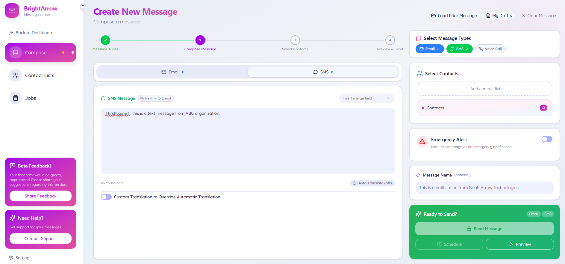 - If your recipients' preferred language is saved in your BrightArrow custom fields, you can use the "Auto Translate" button to have the message automatically translate for each recipient's language.