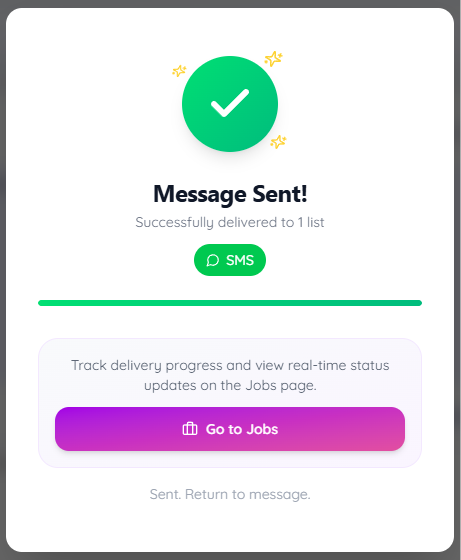 - Your message has been sent! In the pop-up window click "Go to jobs" to watch the message send or to find the report of the message or click "dismiss" to stay on the message creation screen and start a new message.